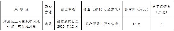我公司受委托,于2017年4月6日上午10時在納溪區(qū)公共資源交易中心面向社會公開拍賣瀘州市納溪區(qū)上馬鎮(zhèn)永寧河泡子沱至苦竹灘河段采砂點(diǎn)的采砂權(quán)。具體事項(xiàng)公告如下:
